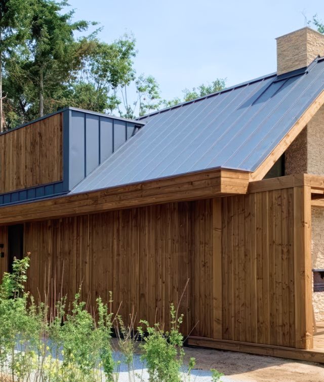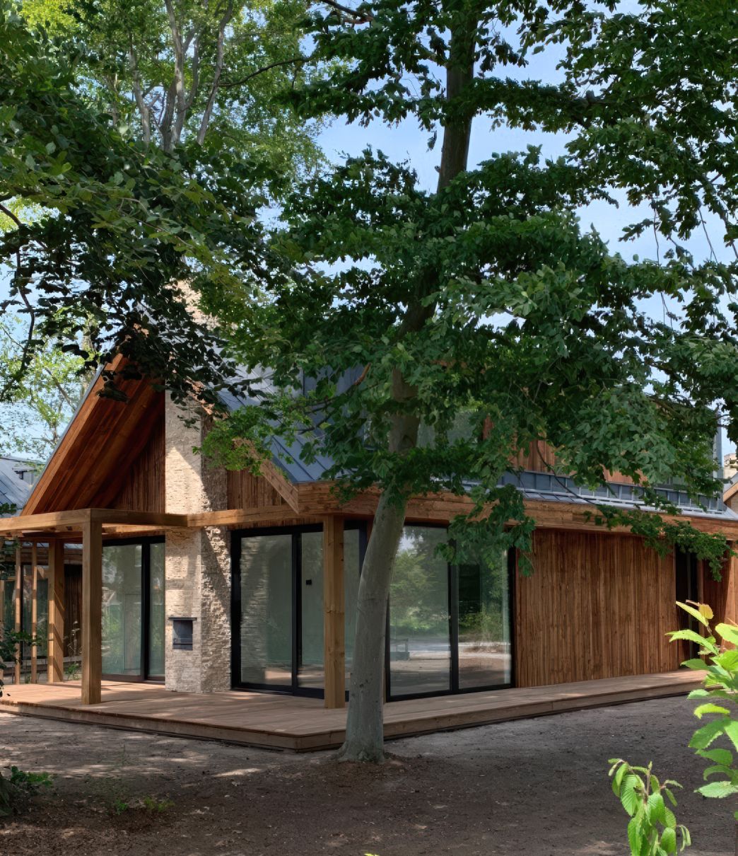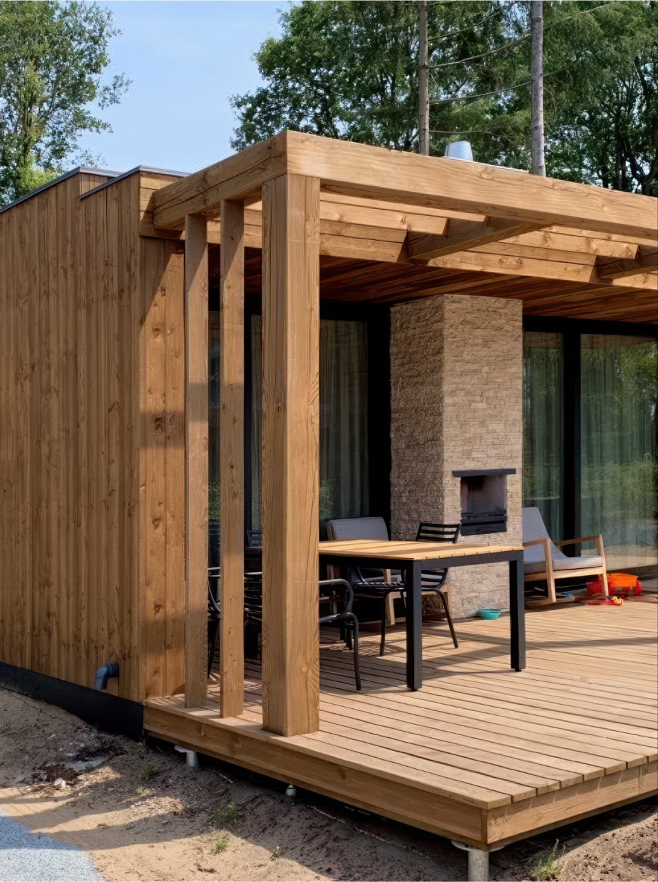 Pour ce projet, le client a choisi une association d’épicéa brûlé dans un ton noisette et de Douglas black, apportant un contraste saisissant de couleurs et de textures à cette maison de piscine moderne.Ce duo ajoute à la fois profondeur et chaleur, s’accordant parfaitement avec le cadre naturel et paisible. Grâce à son design modulaire, chaque élément de la structure est entièrement démontable et réutilisable, permettant de réaffecter les composants dans de futures constructions.Cette approche prolonge considérablement la durée de vie des matériaux tout en réduisant au minimum les déchets de chantier.