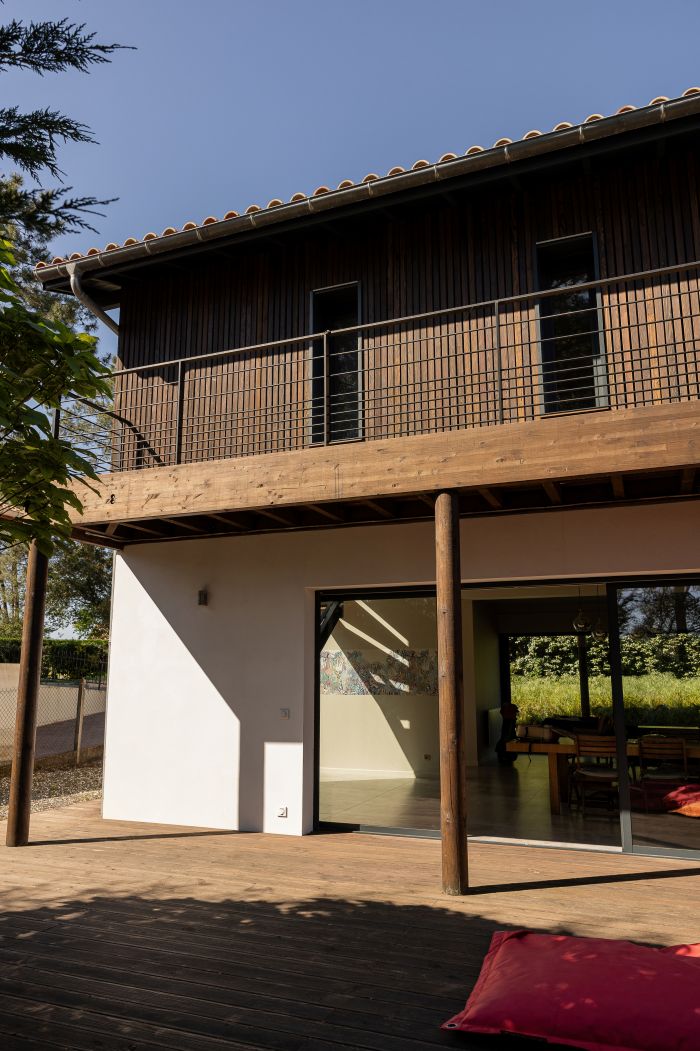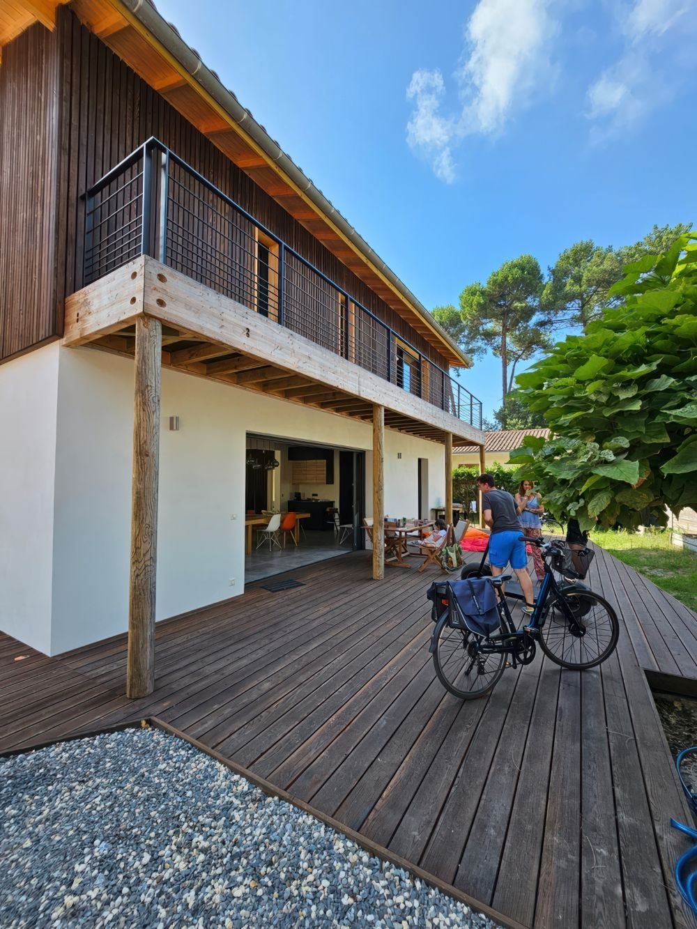 Avec ses teintes chaleureuses et ses qualités naturellement hydrofuges, ce bois s’adapte parfaitement aux humeurs changeantes du Sud-Ouest. La maison d’origine, indépendante, a été partiellement démolie puis reconstruite, offrant une extension élégante qui a agrandi l’espace habitable et transformé la circulation intérieure. Pour sublimer davantage le design, nous avons ajouté quelques touches audacieuses : un escalier en bois associé à une balustrade en acier épurée, apportant une touche moderne au charme détendu de cette maison côtière.