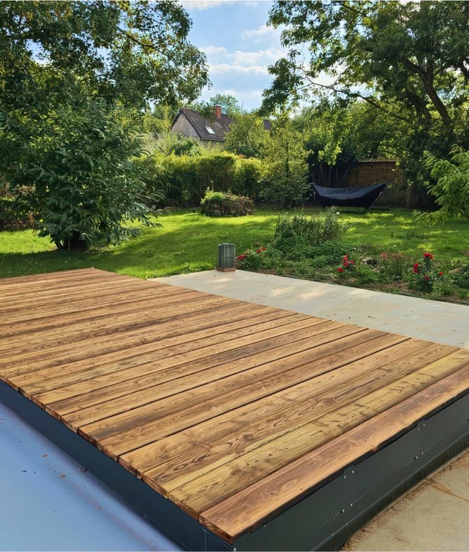 Pour assurer une harmonie parfaite, nous avons utilisé les mêmes finitions bois que celles du platelage autour de la piscine, de la terrasse principale et de l’abri de jardin.